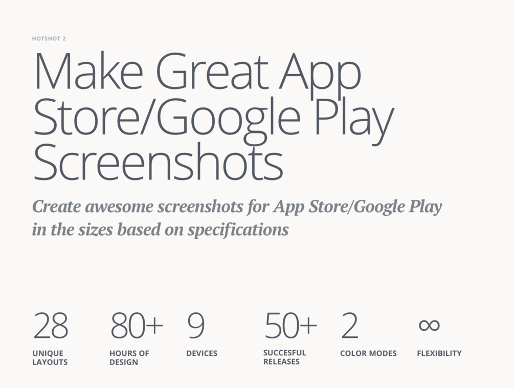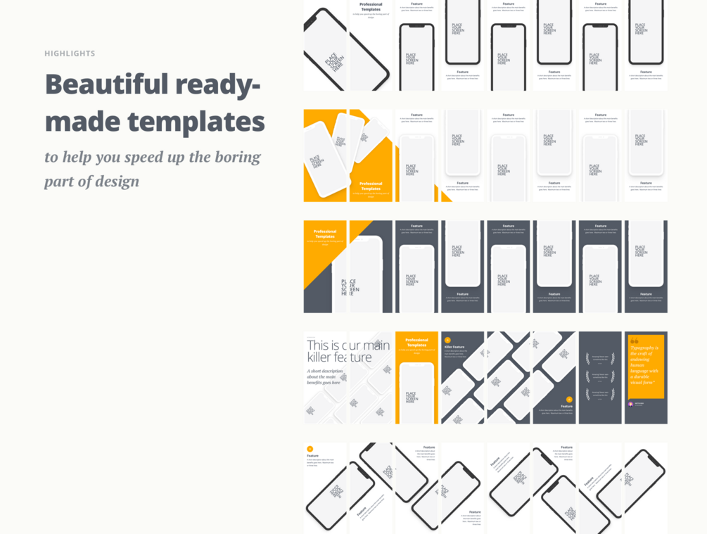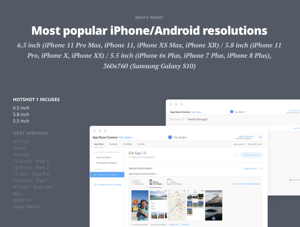 Don't waste your time looking up sizes and templates for App Store/Google Play screenshots. This product covers most popular 6.5β, 5,8β and 5.5β iPhone displays and saves up to 60 hours of work. Speed up the boring part of design.